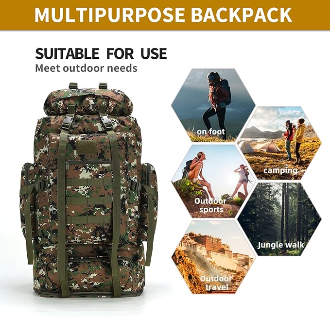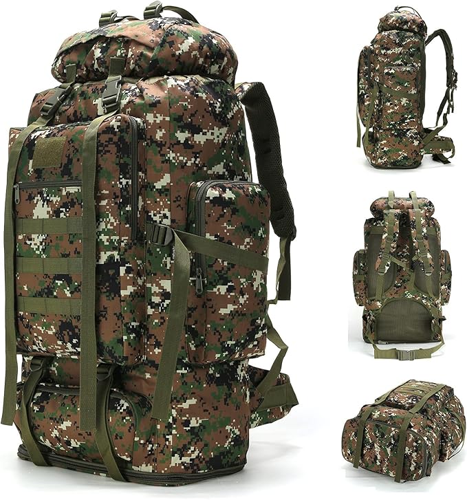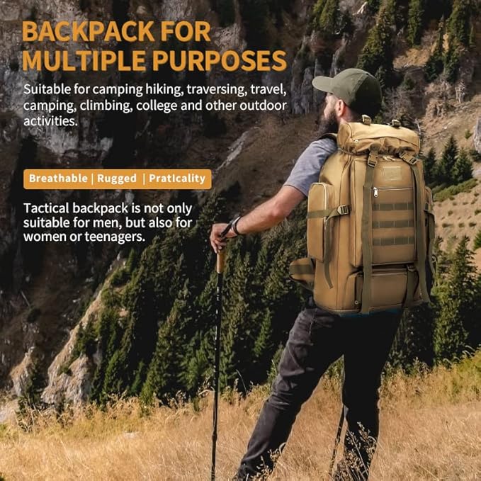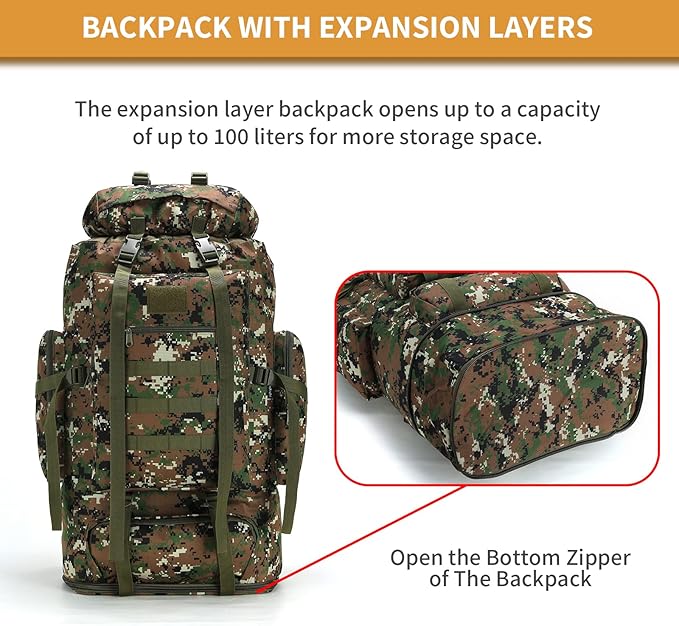 • 【Large Capacity Rucksack】The ripstop survival rucksac with expansion layers, up to 100L Capacity when Opened for more storage.The tactical backpack features spacious compartments and 2 side pockets to keep your belongings organized.The main pocket of the backpack is designed with a drawstring to make it easier to get things.