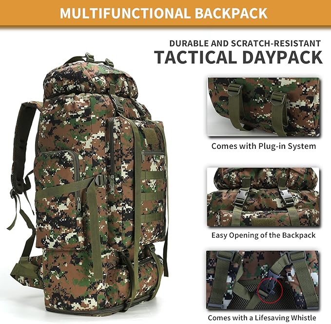 • 【Multifunctional Hiking Bag】Rugged assault military bag comes with plug-in system,the top of the backpack is adjustable for tents and hammocks. The rucksack is equipped with a molle system, which can mount other items or small bags on the rucksack.Multifunctional backpack with chest strap comes with a Lifesaving whistle ,Danger can blew the life-saving buckle.