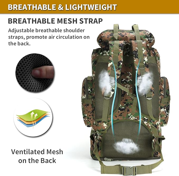 • 【Breathable PratIcality Backpack】This 100L tactical military assault backpack is made of durable double-stitched 600D oxford fabric.The shoulder strap can be adjusted to create your desired length while its cushioned panel reduces strain on the shoulder.Ventilated mesh on the back, shoulder strap and waist belt provide breathable and comfortable, making load-carrying very easy.