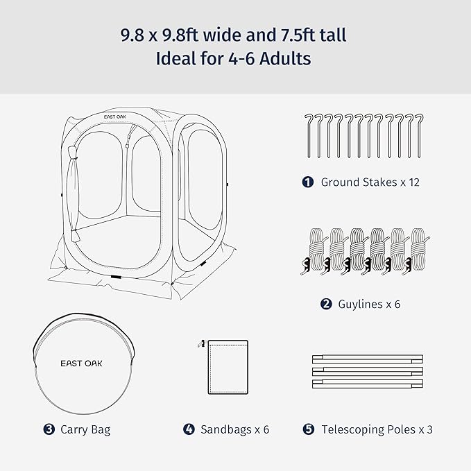 • ๐—ฃ๐—ผ๐—ฝ-๐˜‚๐—ฝ ๐—ณ๐—ผ๐—ฟ ๐—˜๐—ฎ๐˜€๐˜† ๐—ฆ๐—ฒ๐˜ ๐˜‚๐—ฝ ๐—ฎ๐—ป๐—ฑ ๐—ฆ๐˜๐—ผ๐—ฟ๐—ฎ๐—ด๐—ฒ: Suitable for 4-6 people, EAST OAK portable screen house features a convenient pop-up design that allows for easy installation by a single person in under one minute. The tent is designed to be easily folded and has a convenient carrying bag. Packed away in its included carry case, its dimensions measure a coimpact 30.7x3.9x30.7 inches