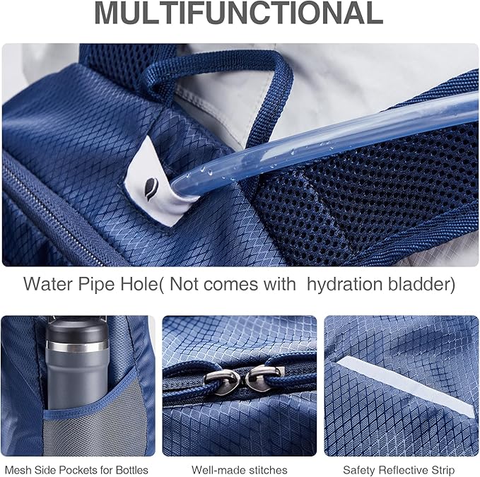• ROMMY 20L CAPACITY: Designed with 20L capacity, the packable backpack has one main zipped compartment, one front pocket and two side pockets keep your things organized and separated. And a water pipe hole on the top side of the backpack to assemble the water bag system.(NOT come with a hydration bladder)