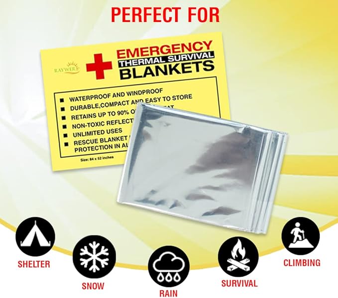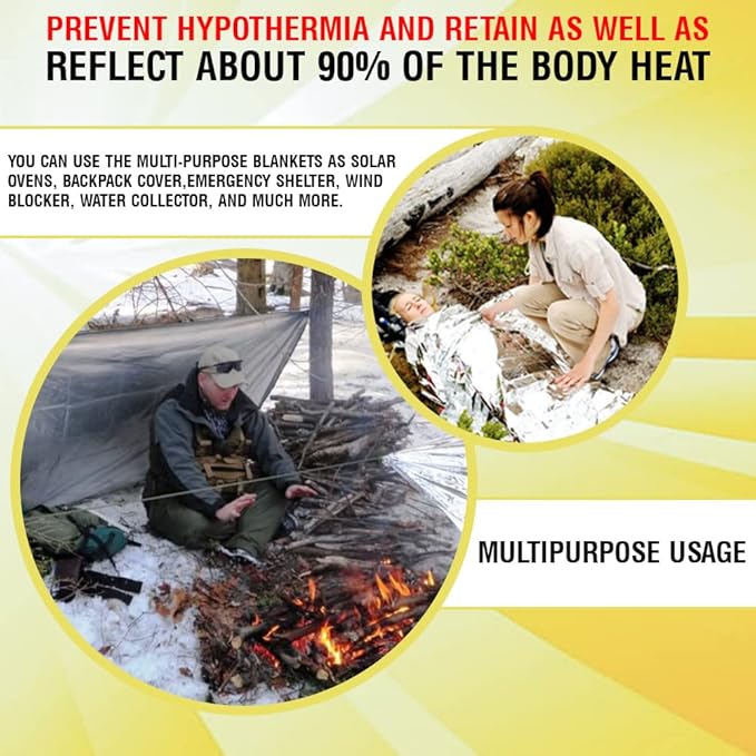 • MULTIPURPOSE USAGE: The lightweight and high portability of these 84 x 52 inches silver emergency thermal mylar blankets come in handy in numerous situations. You can use the multi-purpose blankets as solar ovens, backpack cover, emergency shelter, wind blocker, water collector, and much more.
