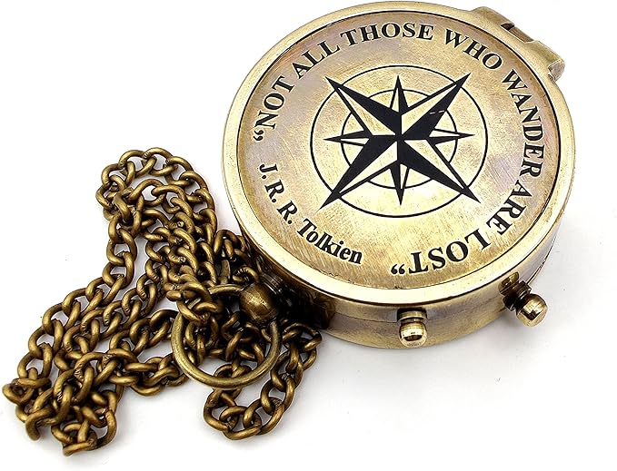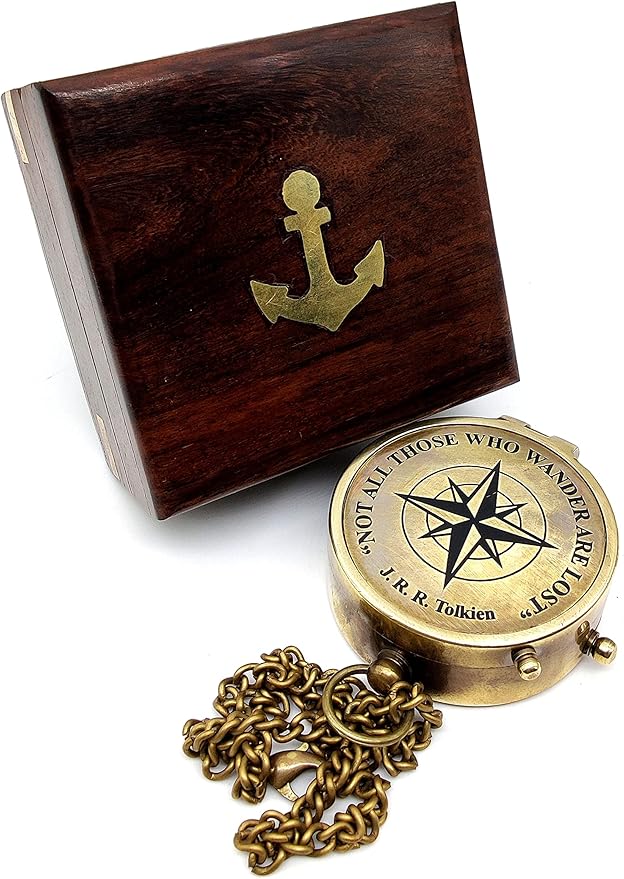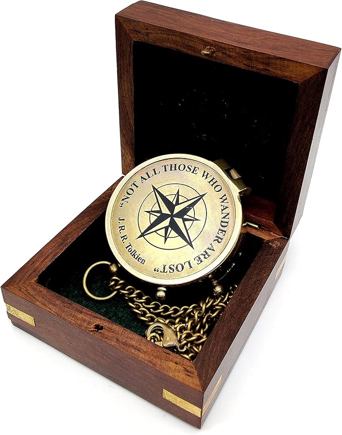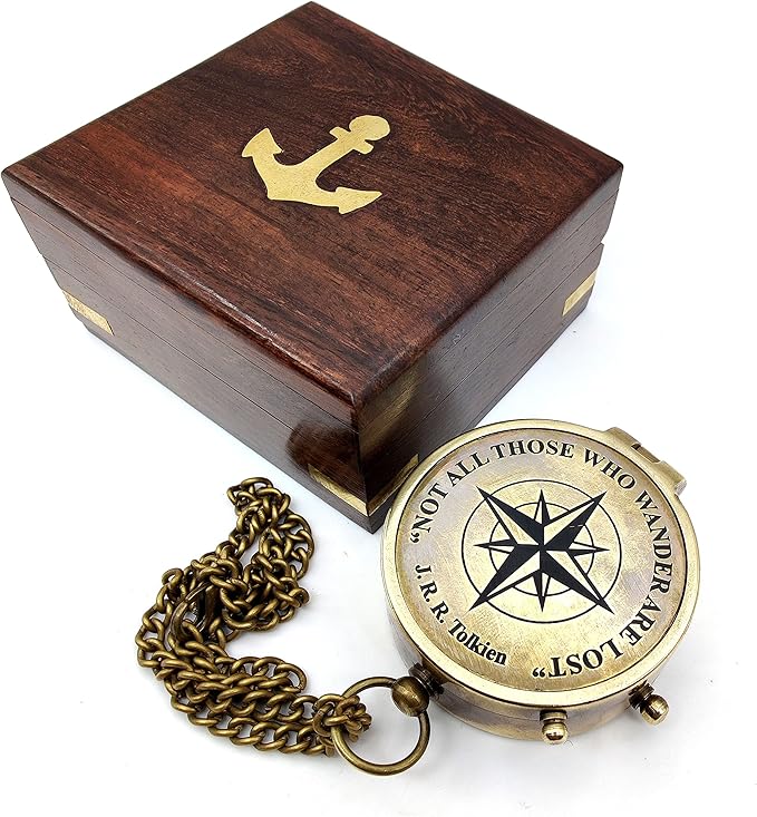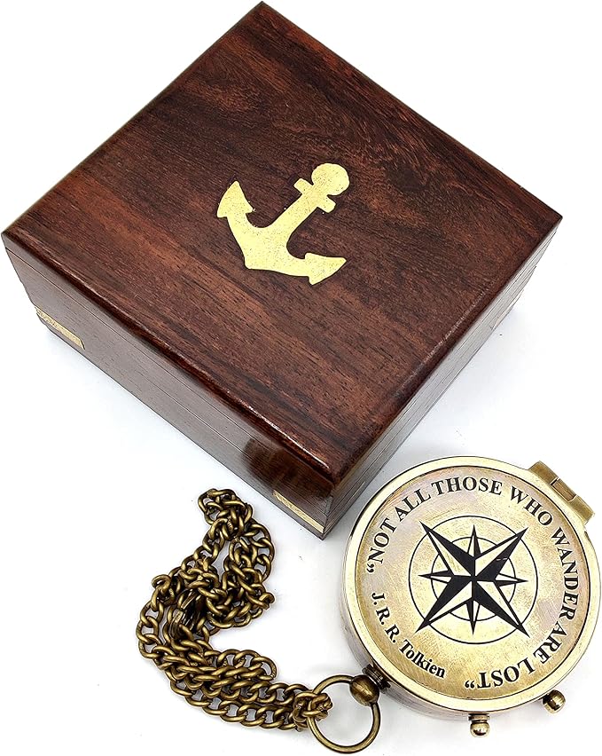 Handcrafted Brass Compass Not All Those Who Wander are Lost Antique Dial Marine Brass Compass Sailor Gifts Direction Pocket Compass for Men, Camping, Graduation Gift Vintage Home Item with wooden Case