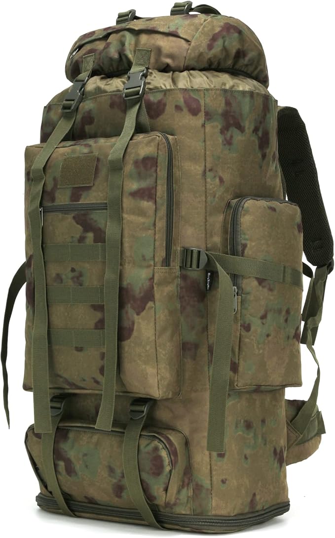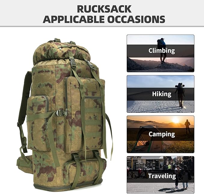 • 【Large Capacity Loading】: 100L large capacity camping mountaineering backpack main bag can hold clothes, quilts, tents, sleeping bags and travel items, and can accommodate 2-3 people travel gear. The molle system can be used to bundle and carry items such as moisture pads, trekking poles, sleeping pads, picnic mats, camera stands and more.