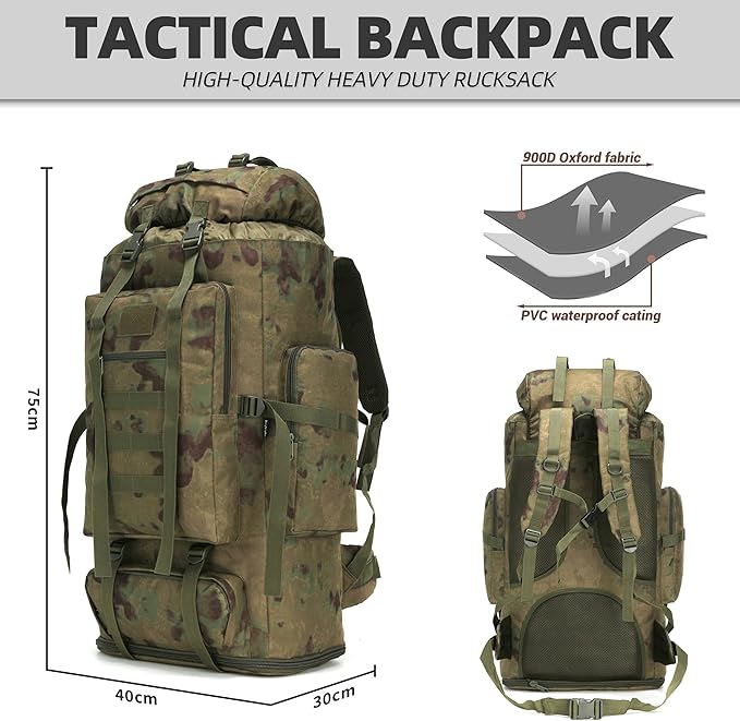 • 【Waterproof Fabric】: The tactical military backpack is made of 900D Oxford cloth and waterproof material. Military backpack thickened density tear-resistant Oxford fabric is waterproof and wear-resistant, tough and odor-free. More durable and scratch resistant than traditional hiking backpacks.