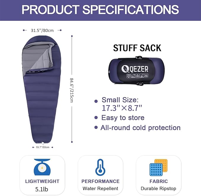 • 【 𝐋𝐈𝐆𝐇𝐓𝐖𝐄𝐈𝐆𝐇𝐓 & 𝐂𝐎𝐌𝐏𝐀𝐂𝐓 】Backpacking sleeping bag Use size: 84.6" x 31.5", Storage size: 17.3" x 8.7" (dedicated compression storage bag), Weight: 5.1lbs. It's about half the weight and volume of a polyester sleeping bag, lightweight, super compact and easy to carry. (Note: The product is extremely compressed when stored, it is recommended to ventilate for 3-4 hours after opening.)