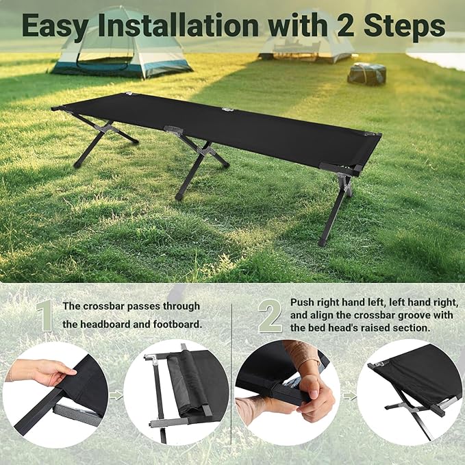 • Portable & Easy Set up: The camping cot is includes storage bag, the size could fit in most car trunk. No tools needed. With folding design, the camping bed is easy to open or fold in seconds which helps you save much more time.
