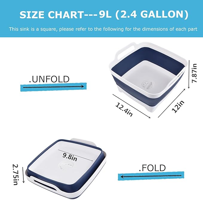 • 【Versatile & Multifunctional】: Foldable washing basket, dish tub RV sink size 9L, Collapsible dish basin with Draining Plug. Easy to fold, take your camping wash station. Collapsible foot bath.