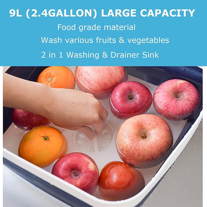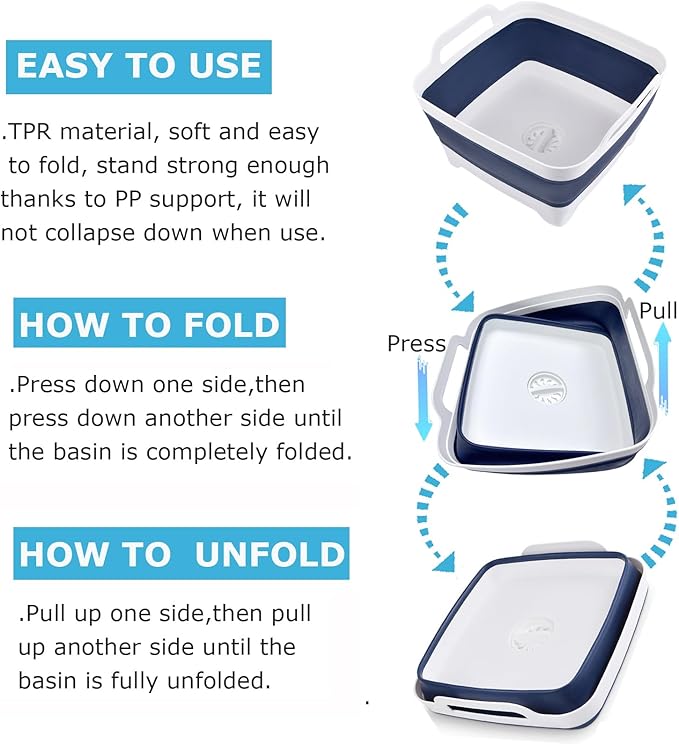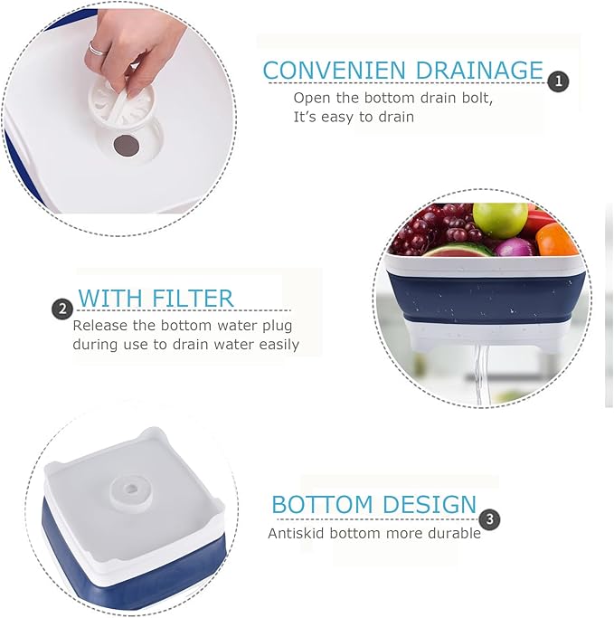 • 【Plug & Drainer】: Camping sink, kitchen sink basin is great for washing dishes, food, bucket with drain, beverage tub, laundry soaking. The collapsible dish drainer is good for basin kitchen, wash bin laundry.