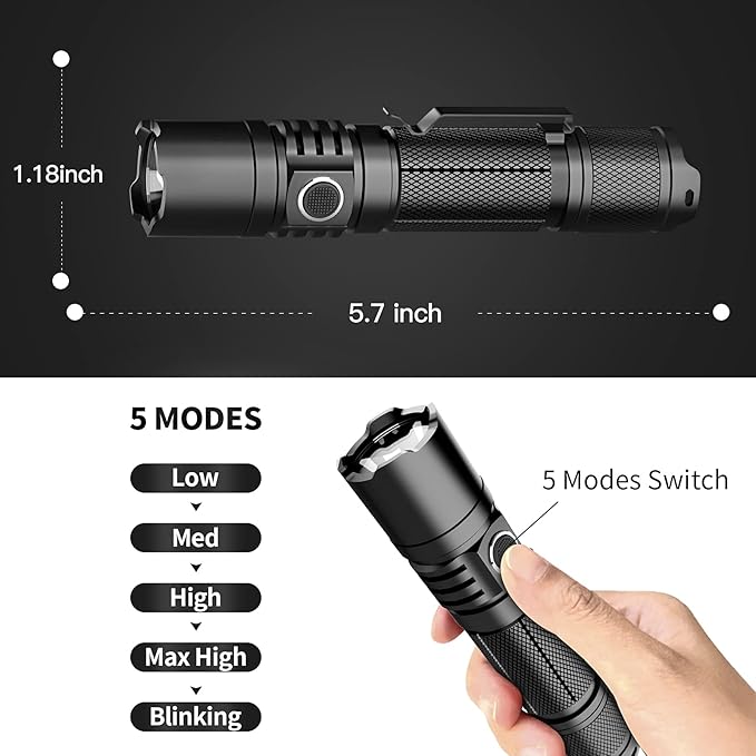 • 【ADJUSTABLE 4 MODES】4 Useful Settings with this tactical flashlight (On/High/Med/Strobe) makes it ideal for user to walk around the house, dog walking, hiking or camping, repairing car and night riding, emergency use,etc.