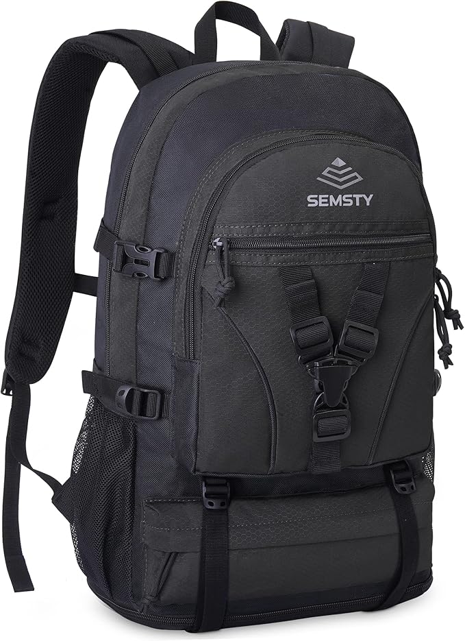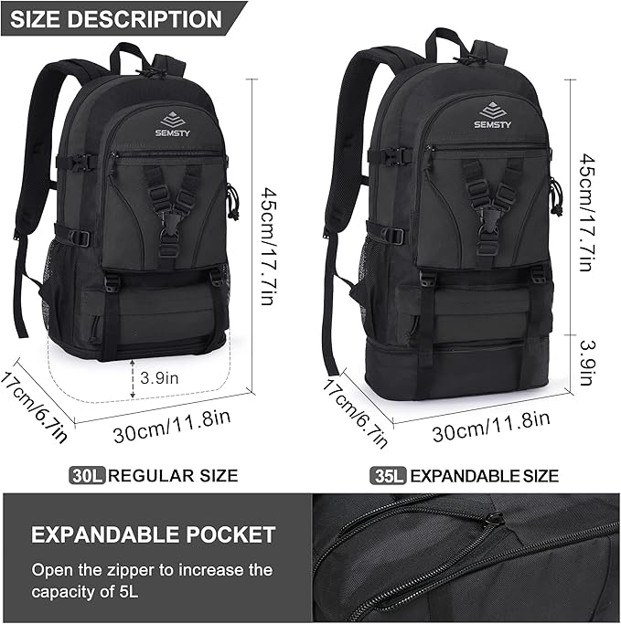 • Expandable & Extra Large Capacity: This hiking daypack can be expanded by using the zipper at the bottom(from 30l to 35l). Roomy enough for a CARRY ON. The side buckles makes your stuffs safe and makes the backpack not too bugling even it's fully packed. Multi-compartments help you organize all your essentials like clothes, camping supplies, gears, etc. Perfect for outdoor activities