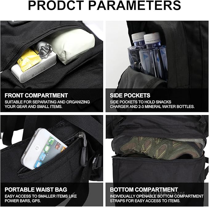 • 👣【HIGH-QUALITY WATERPROOF COVER】: The back pocket of the backpack has a waterproof rain cover. The waterproof rain cover is made of high quality nylon material, with a waterproof outer coating and a polyurethane coating on the inner layer, tear resistant, anti-scratch, wear resistant. Prevents your outdoor gear from getting wet in drizzle, protect your valuables from heavy rain and keep everything dry, very suitable for any rain activity.