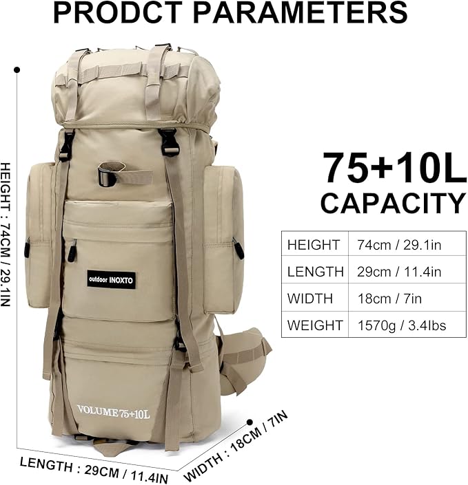 • 👣【LARGE CAPACITY】: Product Size: 29.1 x 11.4 x 7 inch. 85L large capacity internal frame backpack travel, lightweight 3.4 lbs. With multiple pockets and storage compartments, and the large main compartment for a 15.6 '' laptop, and the Bottom compartment has direct access to main compartment and easy access to items without opening the main compartment. In addition, various compression belts can additionally carry trekking poles, sleeping bags, tents and other camping equipment.