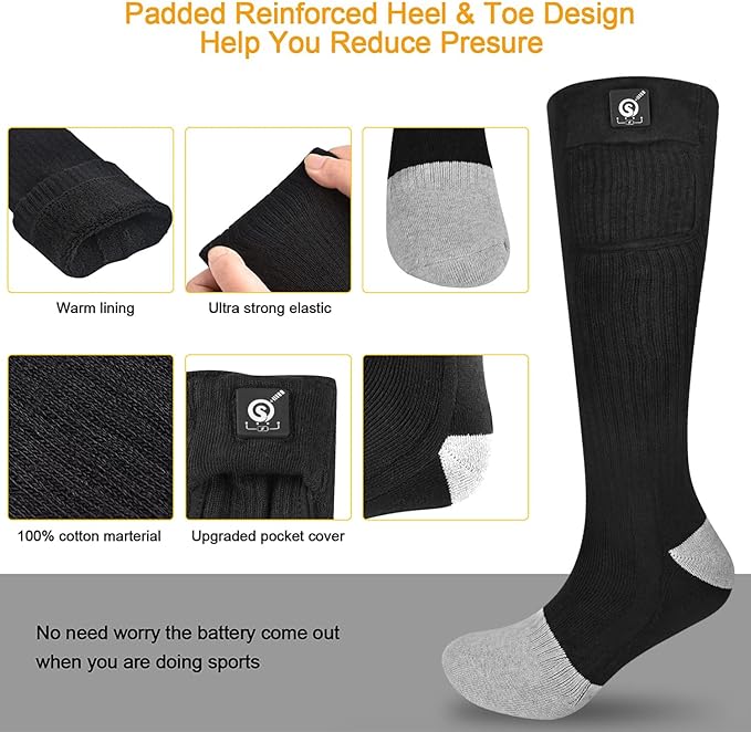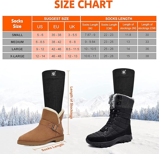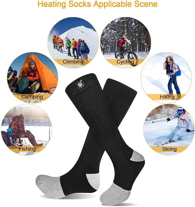 • 【Widely Uses】: SNOW DEER heated socks are used by many people for a variety of different reasons ranging from working in cold conditions, hunting,fishing,skiing,motorcycling,hiking.and even just having cold feet around the house. it is a perfect solution for those chilly winter nights and days.