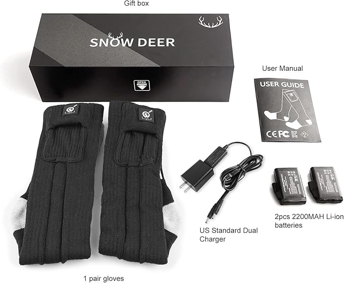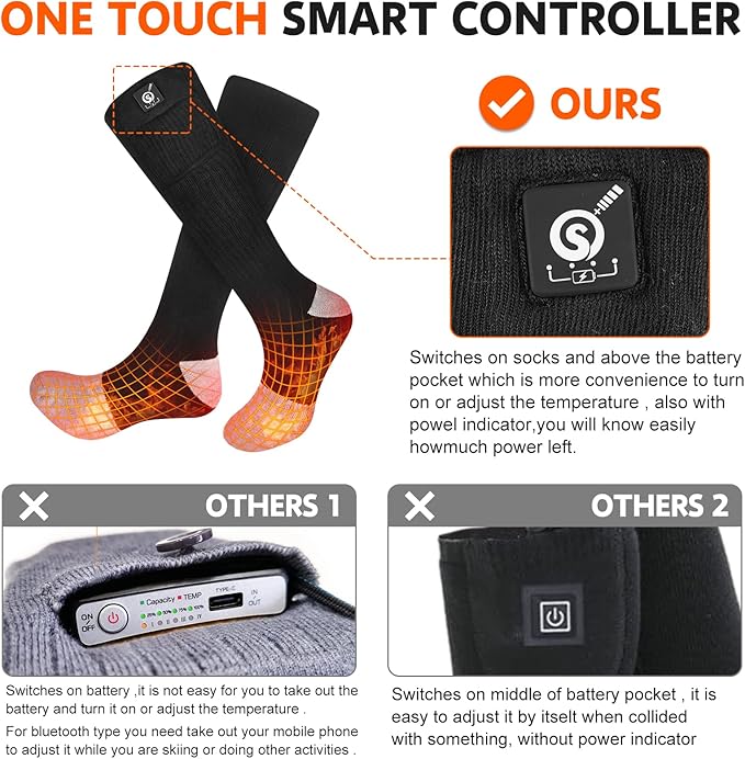 • 【Upgraded One Touch Smart Controller With Power Indicator & Use 7.4V Battery Instead of 3.7V & 5V】: SNOW DEER battery heated socks with Upgraded one touch smart controller which with power indicator. you can easily know how much power left and adjust heat settings easily. Also we used 7.4V 2200mAh lithium polymer rechargeable battery .the heating time will longer than 3.7V&5V heated socks and the temperature will be more stable.