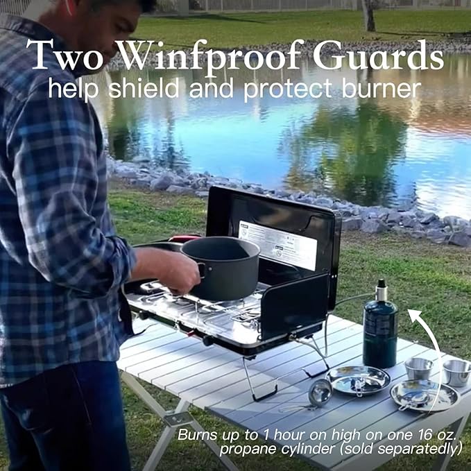 • POWERFUL CAMPING STOVE: Get cooking quickly with our powerful 2-in-1 camping grill stove, featuring 2 burners with 2 x 10000 BTU of cooking power, improved knob rotation for ultimate simmer control, and 2 wind guards to shield and protect burners from wind.