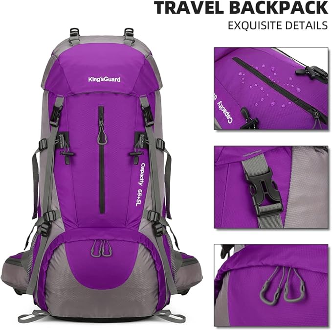 King'sGuard 70L Hiking Backpack Large Lightweight Waterproof Camping Backpack Travel Backpacking Backpack Daypack with Rain Cover -Frameless (Purple)