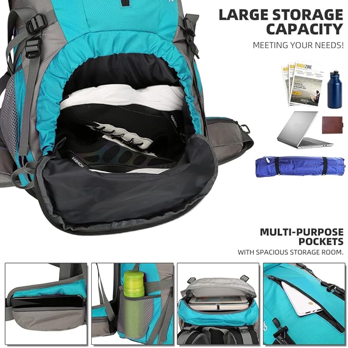 King'sGuard 70L Hiking Backpack Large Lightweight Waterproof Camping Backpack Travel Backpacking Backpack Daypack with Rain Cover -Frameless (Lake Blue)
