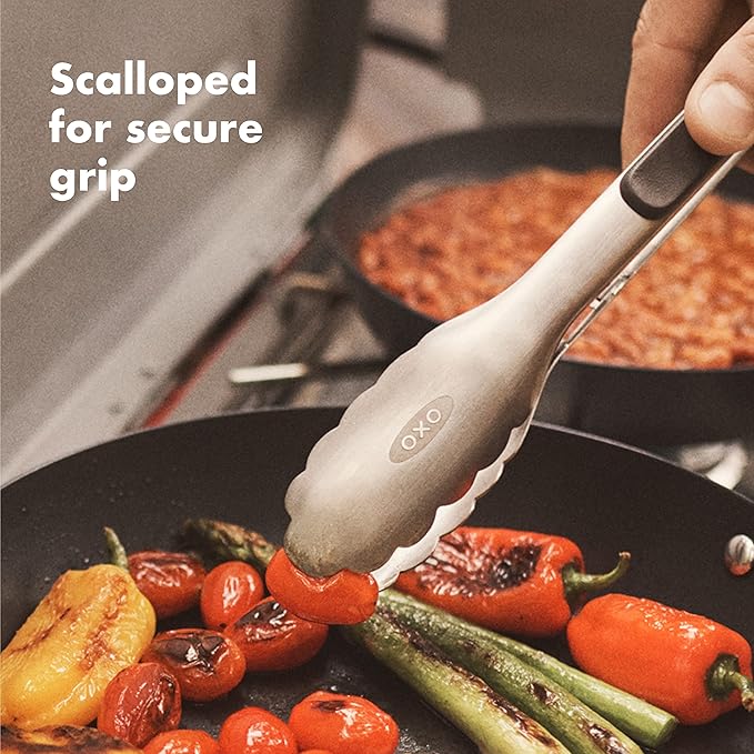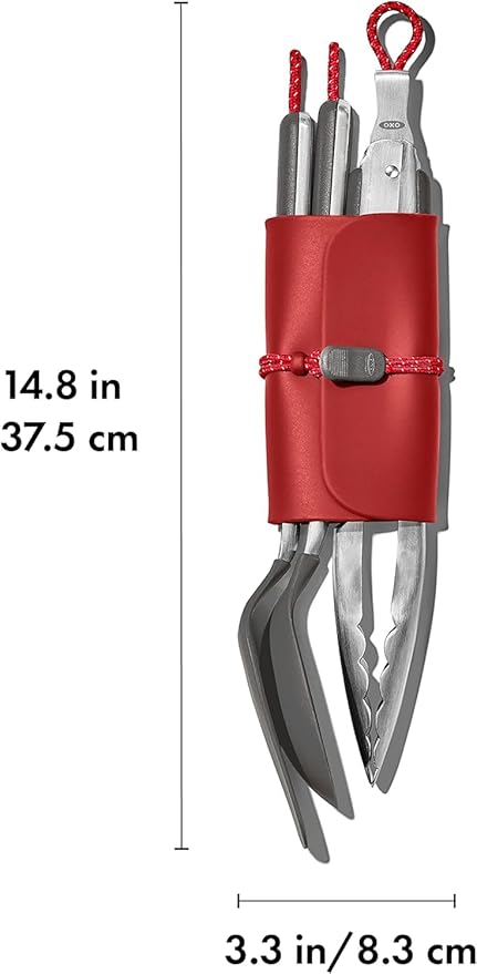 • 10.5-in Stainless Steel Tongs for secure turning and transfer, built-in bottle opener for campsite convenience
