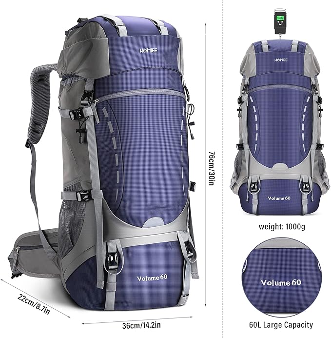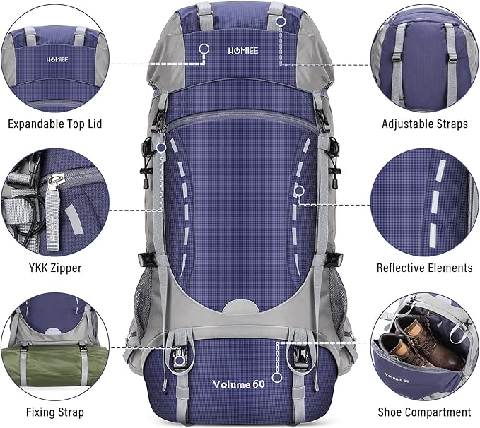 • 60L Large Capacity & Multi Pockets: With a large capacity of 60 liters and multi-compartment design to store different things, the hiking daypack meets most airline size requirements and is large enough for a 5 or 7 day trip. 1 large main drawstring pocket, 1 expandable top pocket, 1 internal hydration bladder pocket, 1 easy-access front pocket, 2 side pockets for water bottles or umbrellas, 1 shoe compartment and rain cover pocket, 1 hip pocket for small items.