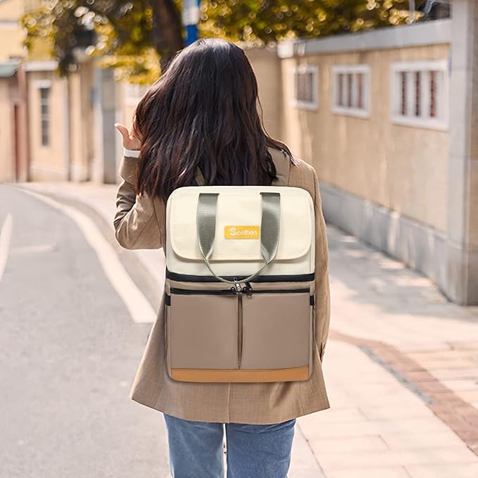• 🍱Hot & Cold Separation Design: Our cooler backpack with double decker is design for women. A bottom compartment for cold, fresh contents that can also house ice packs, and an upper compartment for warm, dry goods and lunch. We recommend storing hot and cold foods and drinks separately for better results. It is a must-have backpack cooler for women hiking! It can also be used as a breastmilk cooler bag to keep your drinks 🍹 cold and keep your breast bottle 🍼 warm!