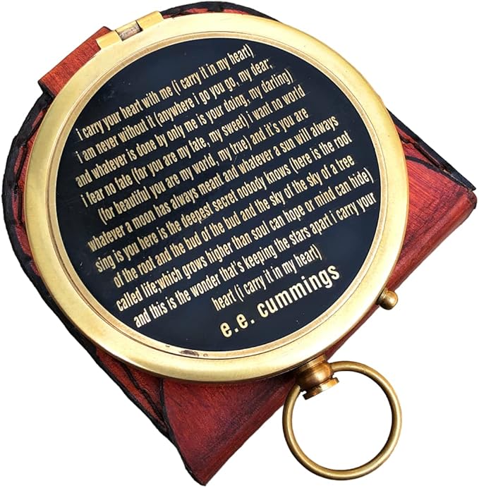 • PREMIUM QUALITY COMPASS: Premium quality handcrafted brass compass and leather case, E E Cummings famous Poem I carry Your Heart Solid brass compass. The high-quality jewelled compass needle settles to north very quickly for well-timed and accurate reading. This Compass Provides Accurate directional assistance. this compass can also be used for Camping, Hiking or Adventure Traveling.