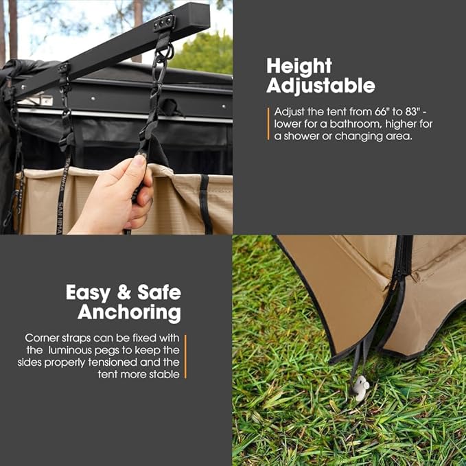 • Customizable Height: Designed for quick setup, this tent unfolds and secures with pegs in just 30 seconds. Adjustable straps let you lower it for a bathroom or raise it for a shower or changing area, with a height range of 66.92 inch to 82.68 inch to fit various vehicle heights and easily mount to your 4x4 or camper trailer. Structural poles in the bottom seam ensure stability, so you can hang towels and store items without sagging.
