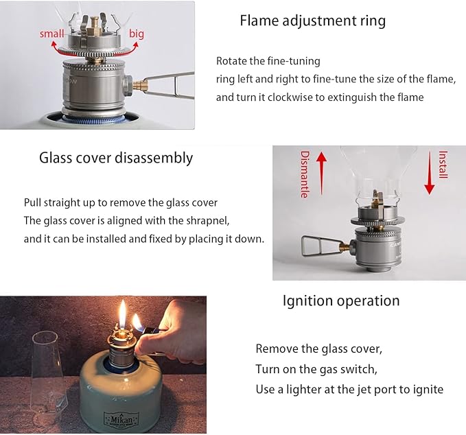 • Extended brass nozzles, stable fuel output and air inlet holes surrounded from below for better combustion The glass cover is stable and easy to disassemble and has an adjustable valve.