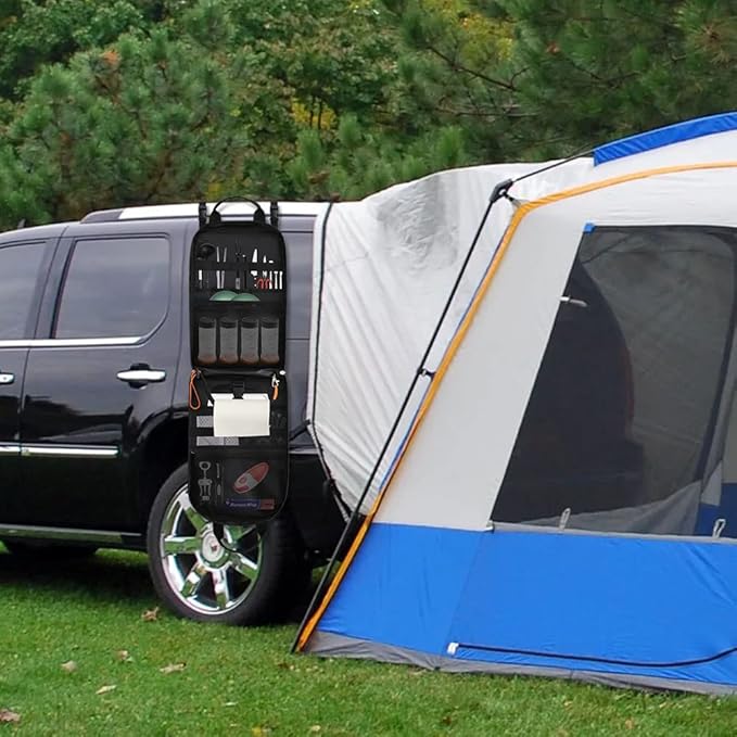 • 【Hang Enywhere】Adjustable clasp for hanging on camping ridge poles, caravan awnings, trees, roof carriers, or on car windows, allowing you to free up space on your camp table and keep your camp cooking area clean and organised. Neatly organises your cutlery, spices, camping gear and more in one convenient place.