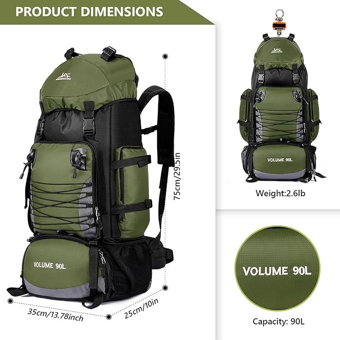 • 【large Hiking Backpack】The Hiking Backpack only 2.6 pounds for 90L large capacity, reducing the backpack loading weight so that you can carry more other items. The maximum loading bearing is 45lb. Unfold size:35x25x75 cm/10x13.8x29.5 inches. Perfect for a 5-7 day hiking trip.