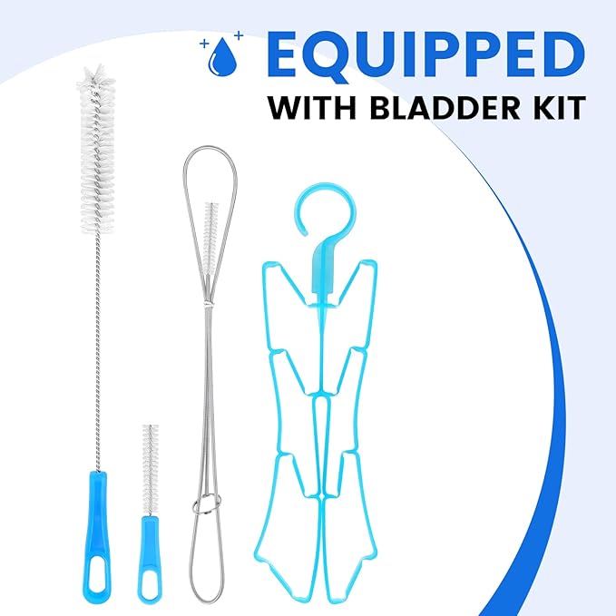 • 【4 in 1 Bladder Cleaning Kit】The order Include a Hydration Pack, a 3L bladder, and a set of bladder cleaning kit. 4 in 1 set for hydration bladder cleaning and drying----1* flexible snake brush, 1* smaller brush, 1* bigger brush and 1* collapsible frame. Stainless Steel 304: Strong and Durable; Brush is straight and enduring.