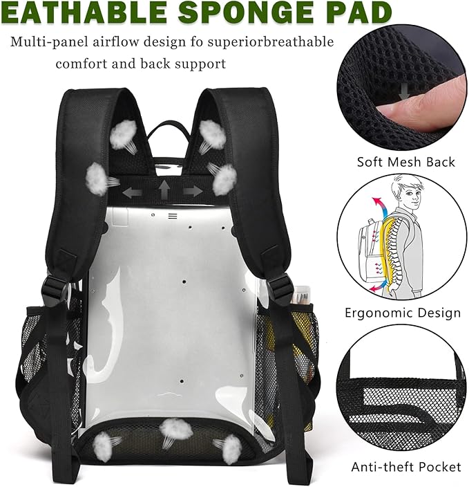 • Ergonomic Design See Through Backpack -Ergonomic design of S-shape padded shoulder straps and padding back design, made from high elastic and breathable sponge and fabric, equipment with ring type adjustable hasp, adjust the strap length freely , reduce the burden of weight, protect the back and shoulder effectively, more comfortable for your life.