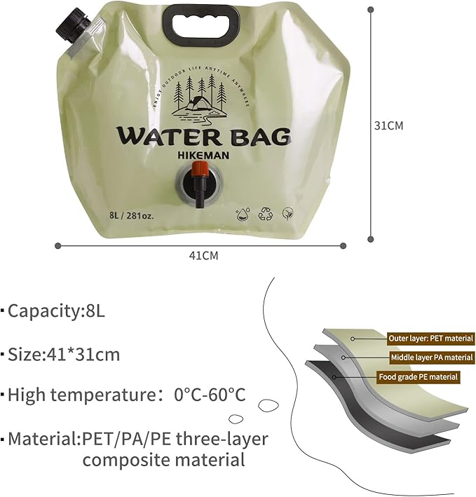 • Safe Materials:Collapsible water container bag is made with environment-friendly premium PET PA PE plastics.Odorless,tasteless,durable and reusable.