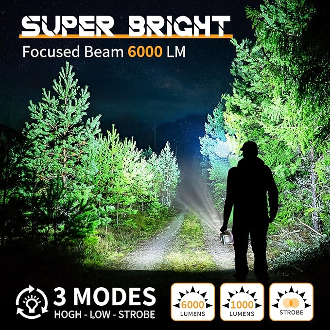 • 🏆【Super Bright Flashlight】9 Light Modes: front light (High -Meidum- Strobe), Rear lights(Strong uv light-Meidum uv light-red warning light), side light (High-Meidum-Low reading light), this spotlight provides an intense beam of light up to 6000 lumens, with a maximum illumination distance of 5000ft.Protecting you from worries in the dark.