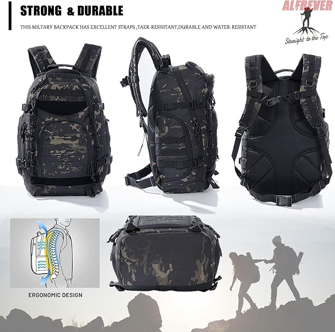 • 38L Large Capacity Backpack: ALFREVER tactical backpack measures 22" x 13.5" x 8", capacity: 38L. Large capacity assault bag, allowing you to carry all your tactical gear.