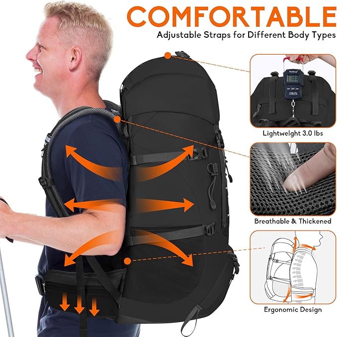 • Waterproof and Durable: Climbing backpack is made of high quality nylon fabric, which is tear resistant, scratch resistant, wear resistant. You can also use our rain cover (our hiking bag comes with a rain cover at the bottom) to further protects your valuables from heavy rain and keeps everything dry