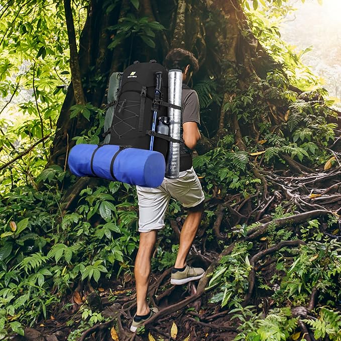 • Large Capacity & Multi Pocket: Main pocket of camping backpacking bag uses the closed drawstring design. With one Interior Pouch for water bladder. There are two small pockets on the top (external and internal) for carry-on items. One pockets on the front can store snacks and coats. There is a compartment for the sleeping bag at the bottom. Two side mesh pockets to carry more water bottles. Two waist pockets for phone
