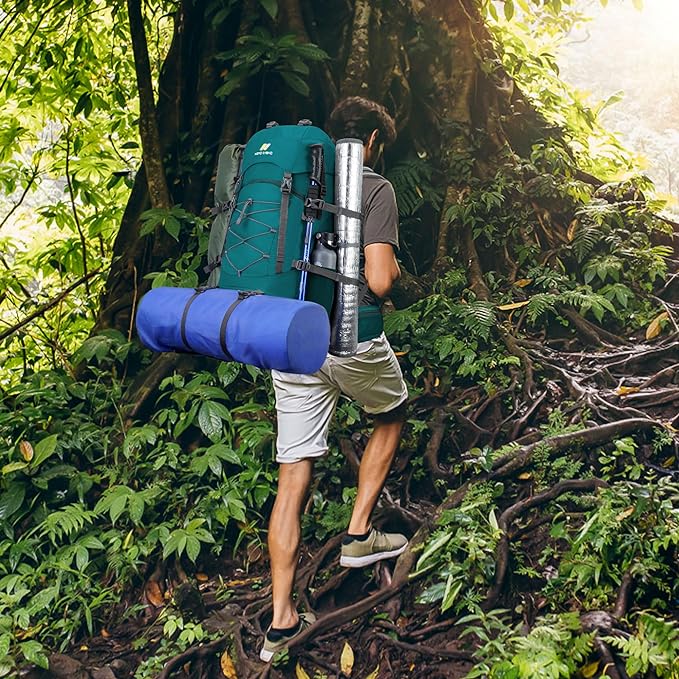 • Large Capacity & Multi Pocket: Main pocket of camping backpacking bag uses the closed drawstring design. With one Interior Pouch for water bladder. There are two small pockets on the top (external and internal) for carry-on items. One pockets on the front can store snacks and coats. There is a compartment for the sleeping bag at the bottom. Two side mesh pockets to carry more water bottles. Two waist pockets for phone