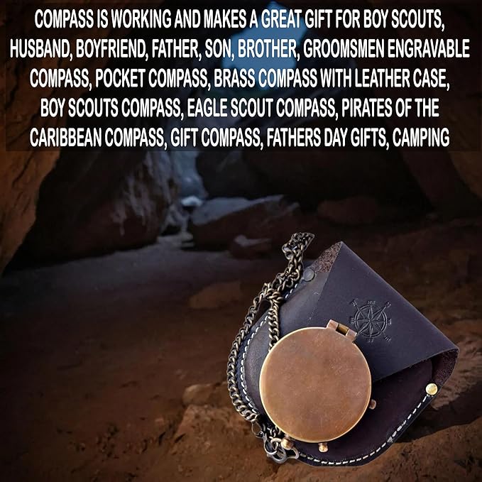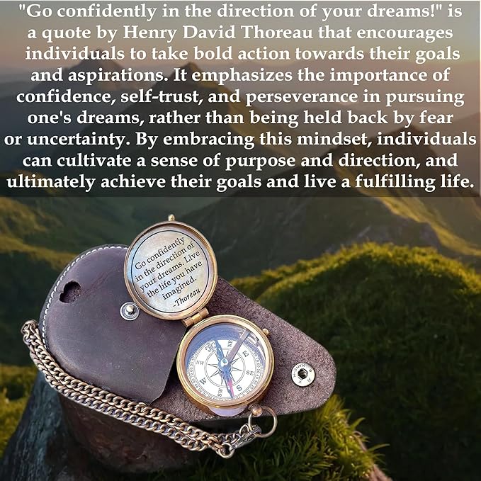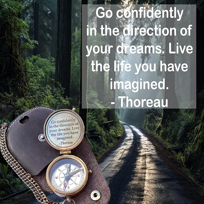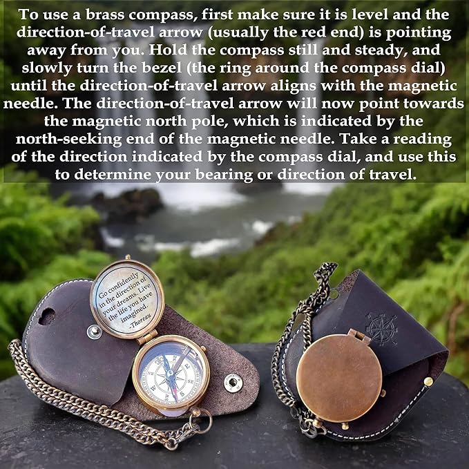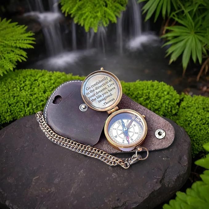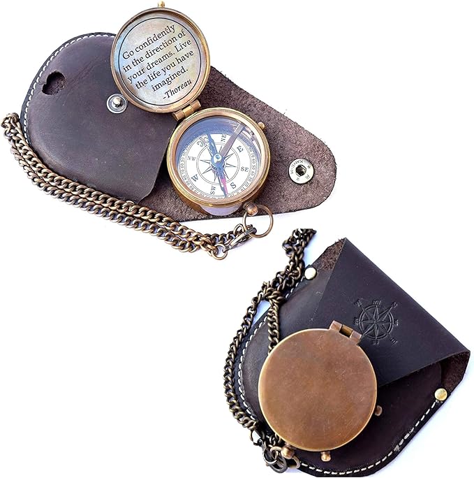 • Personalized Gift Compass: Brass Engraved Compass with Stamped Leather case. Brass Compass "GO CONFIDENTLY IN THE DIRECTION OF YOUR DREAMS LIVE THE LIFE YOU HAVE IMAGINED". Under the glass cover is beautiful, the high-quality jeweled compass needle settles to the North very quickly for timely and accurate readings. It has a small lever on the side of the compass that operates a needle lift mechanism to protect the compass bearing. Gift for someone you love. Engraved message of the Compass.