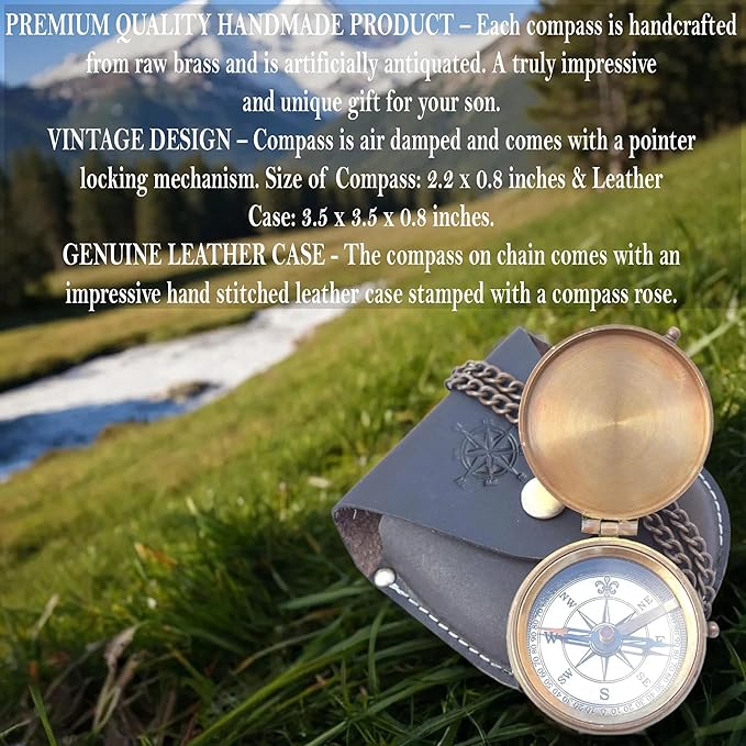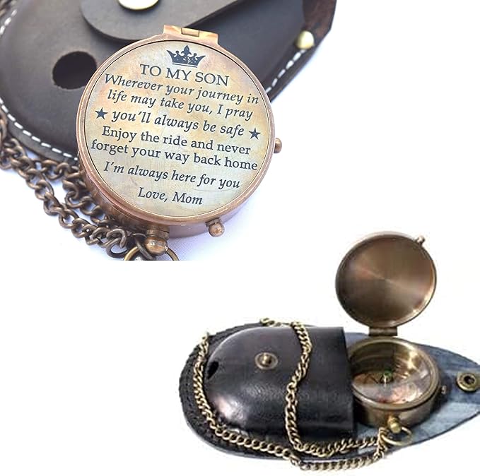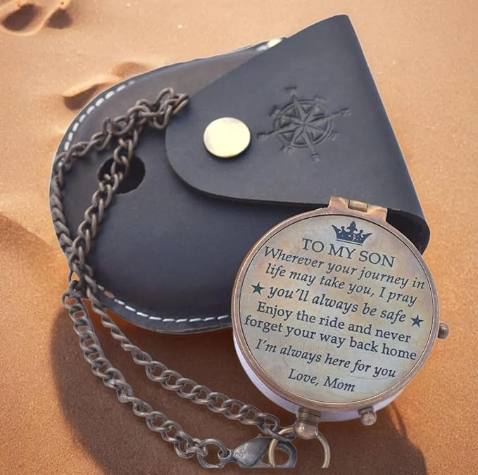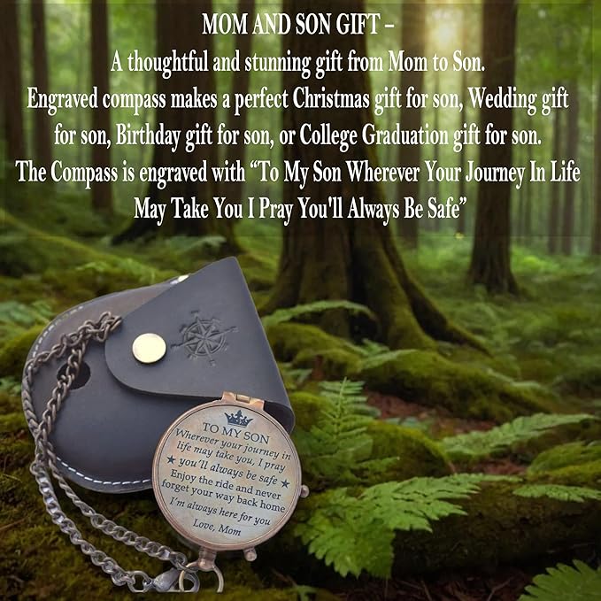 • MOM AND SON GIFT – A thoughtful and stunning gift from Mom to Son. Engraved compass makes a perfect Christmas gift for son, Wedding gift for son, Birthday gift for son, or College Graduation gift for son. The Compass is engraved with “To My Son Wherever Your Journey In Life May Take You I Pray You'll Always Be Safe”