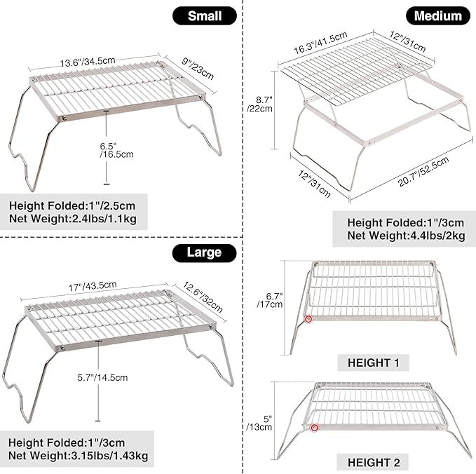 • 【2 Heights Available】This foldable backpacker camping grill mesh has 2 holes on every side, this design provides us 2 heights available which are 6.3”/16cm and 4.7”/12cm. Choose different holes to adjust the height.