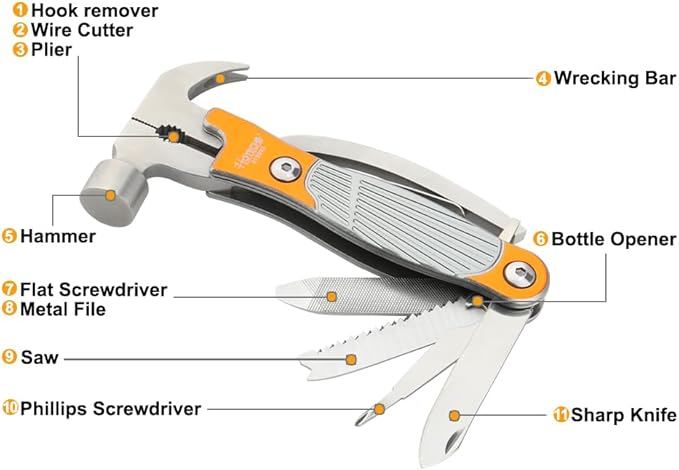 • 【Versatile 11-in-1 Function】The HOTECHE Multifunctional Hammer offers an impressive range of 11 functions in one tool, including a hook remover, plier, wire cutter, hammer, wrecking bar, flat screwdriver, Phillips screwdriver, bottle opener, saw, sharp knife, and metal file. It's like having a complete toolkit in the palm of your hand