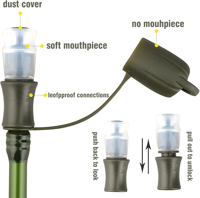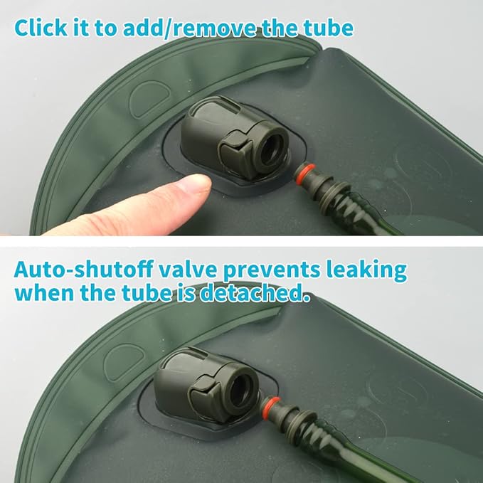 • WELL-SEALING WATER BLADDER – You won't be slowed down with our high flow bite-valve. Simply bite the mouthpiece to suck water. Soft mouthpiece with easily accessible ON/OFF valve. It also has a cover to keep dirt out. Conveniently control the water flow by biting. Quick-release tube is detachable. While the tube is removed, the connnector automatically shut off and the hydration bladder will stay filled. Store neatly in fridge/icebox without tangling hose.