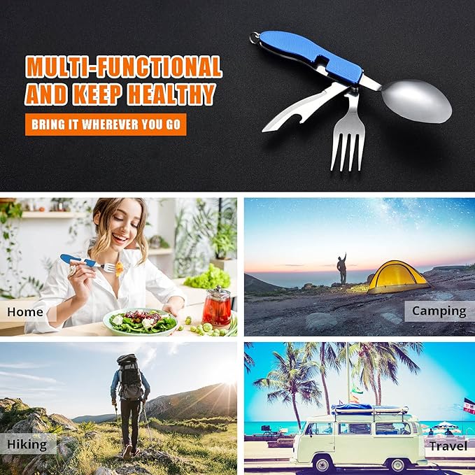 • 4-IN-1 MULTITOOL UTENSIL: Looking for a foldable, compact but all in one camping utensils? You just found it! Equipped with a detachable fork, spoon, knife and bottle opener set, our camping cutlery set is easy to store in your pocket or pack so you’ll always be prepared - the perfect companion on the go.