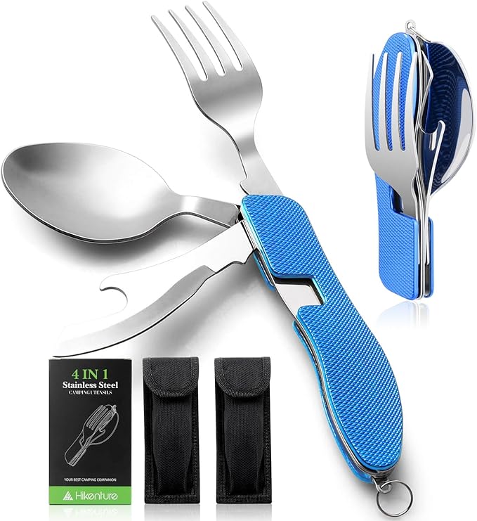 HIKENTURE Camping Utensils 2 Pack,4-in-1 Stainless Steel Spoon, Fork, Knife, and Bottle Opener Combo - Lightweight and Portable Travel Eating Silverware for Hiking, Backpacking, Boy Scout(Blue 2pack)