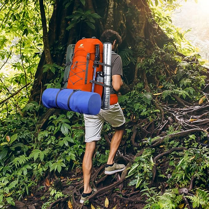 • Large Capacity & Multi Pocket: Main pocket of camping backpacking bag uses the closed drawstring design. With one Interior Pouch for water bladder. There are two small pockets on the top (external and internal) for carry-on items. One pockets on the front can store snacks and coats. There is a compartment for the sleeping bag at the bottom. Two side mesh pockets to carry more water bottles. Two waist pockets for phone