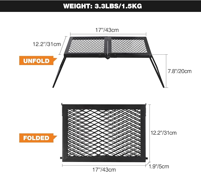 • Dimensions: The open size of the camping grill grate is 13.8''x7.5''x11.4''/35x19x29cm. The folded size is 17x31x20’’/43x31x20cm. The weight is 4.4lbs/2kg. Great for 1 or 2 people to use.