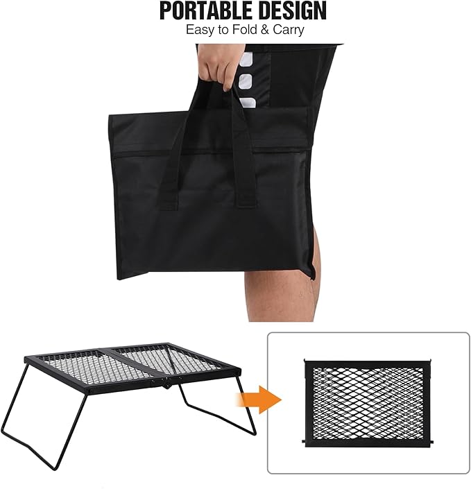 • Foldable & Easy to Carry: The campfire grill can be folded easily and put into the storage bag, which is space saving. It’s convenient to use without any help, easy to carry everywhere.