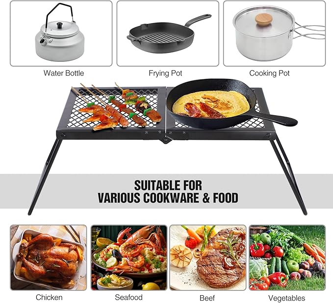 • 2-in-1 Design: The folding camping grill is designed specially with half mesh and half plate. The mesh grill is for barbecue, while the plate can be used to cut vegetables and meat. It can accommodate multiple kettles, pans, and pots.