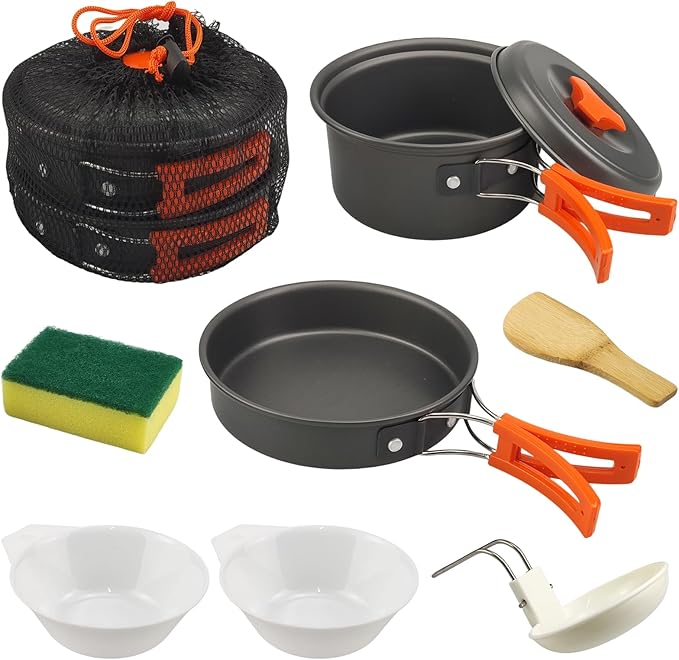 • 7 PCS Outdoor Cooking Sets:saucepan(5.9*2.8inch/0.9L),frying pan(5.9*1.3inch/50ML),2 Bowls + Soup Spoon + Wooden Spoon Spatula + Cleaning Sponge + Nylon Travel Bag Drawstring Pouch